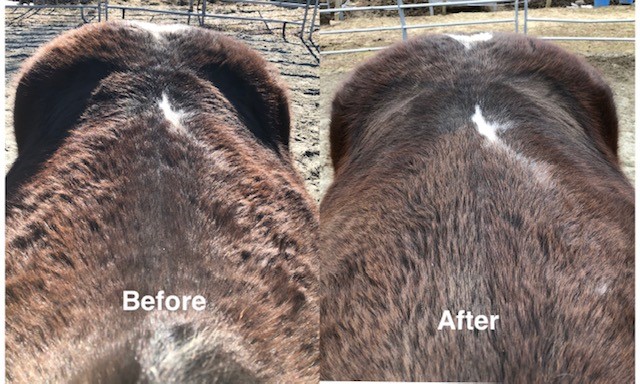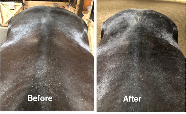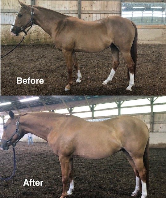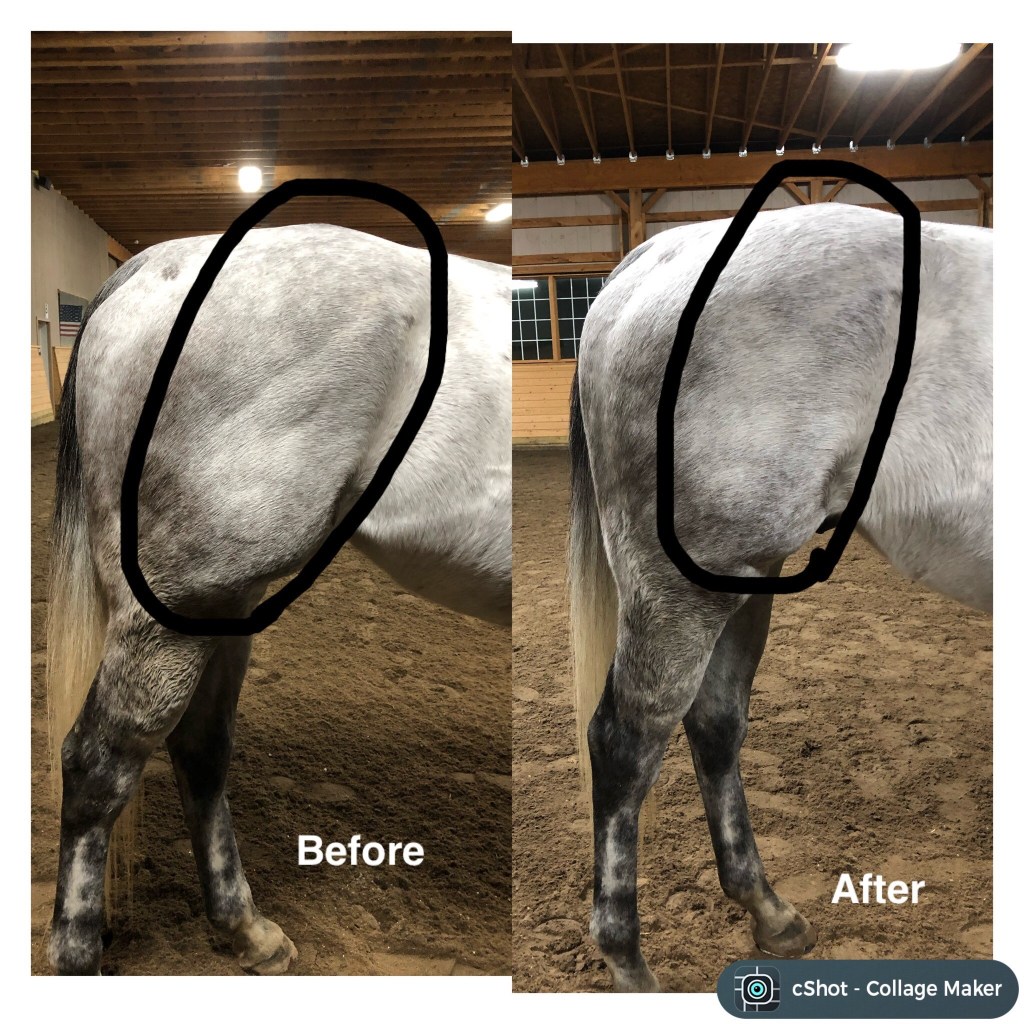 An example of what correct body work can do over time to help build a stronger, healthier and balanced horse. Releasing muscular tension in the withers, back and hind end allowed this horse to return to a more symmetrical and balanced state. Owner reported improved ability to travel “straight.”